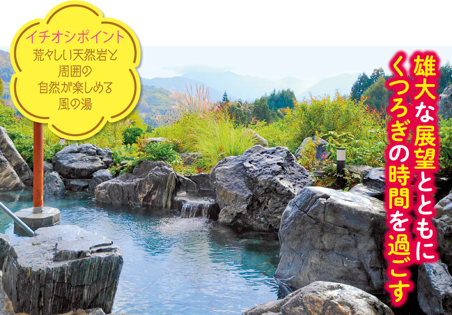展望自慢や地元の人にも愛される日帰り温泉を紹介。気軽に立ち寄れ、旅の疲れをリセットできる。