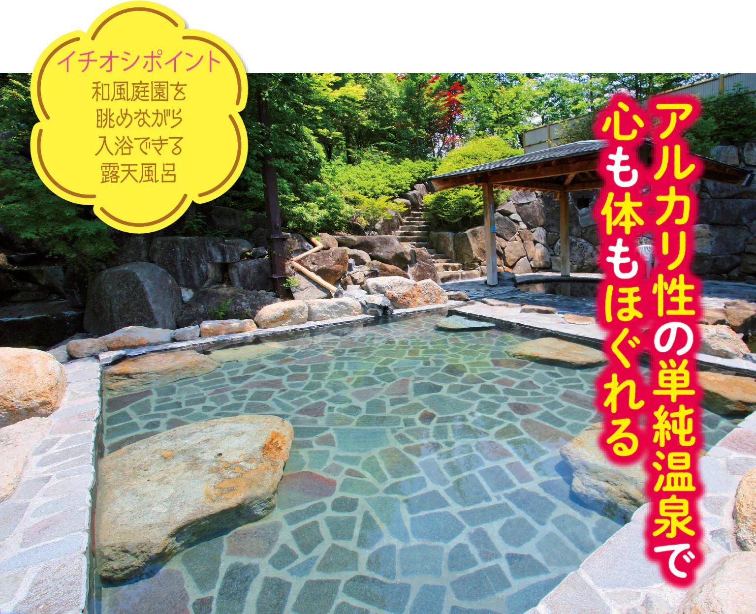 美肌効果や疲労回復に効能がある温泉で、男女とも風情がある露天風呂と内湯、サウナがある。宿泊施設とレストランを完備しているのもうれしい。