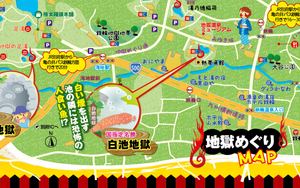 別府観光の大本命、べっぷ地獄めぐり。この世に存在する地獄は、鉄輪と柴石エリアに計7つ。エンマ様のナビゲートで別府の地獄にいざ出発!