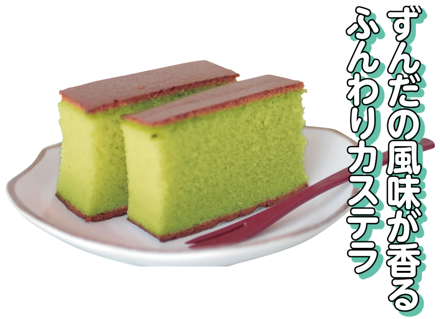 ふわふわとした食感の生地に、宮城名物ずんだを混ぜ込んだ上品な甘さのカステラ。移動の際のおやつやおみやげなどにもおすすめ。