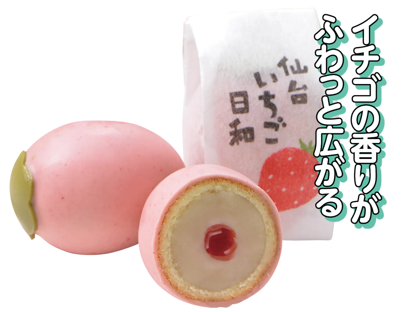 イチゴジャム、ミルク餡、スポンジをイチゴチョコでコーティング。「かもめの玉子」に並ぶさいとう製菓の人気商品。