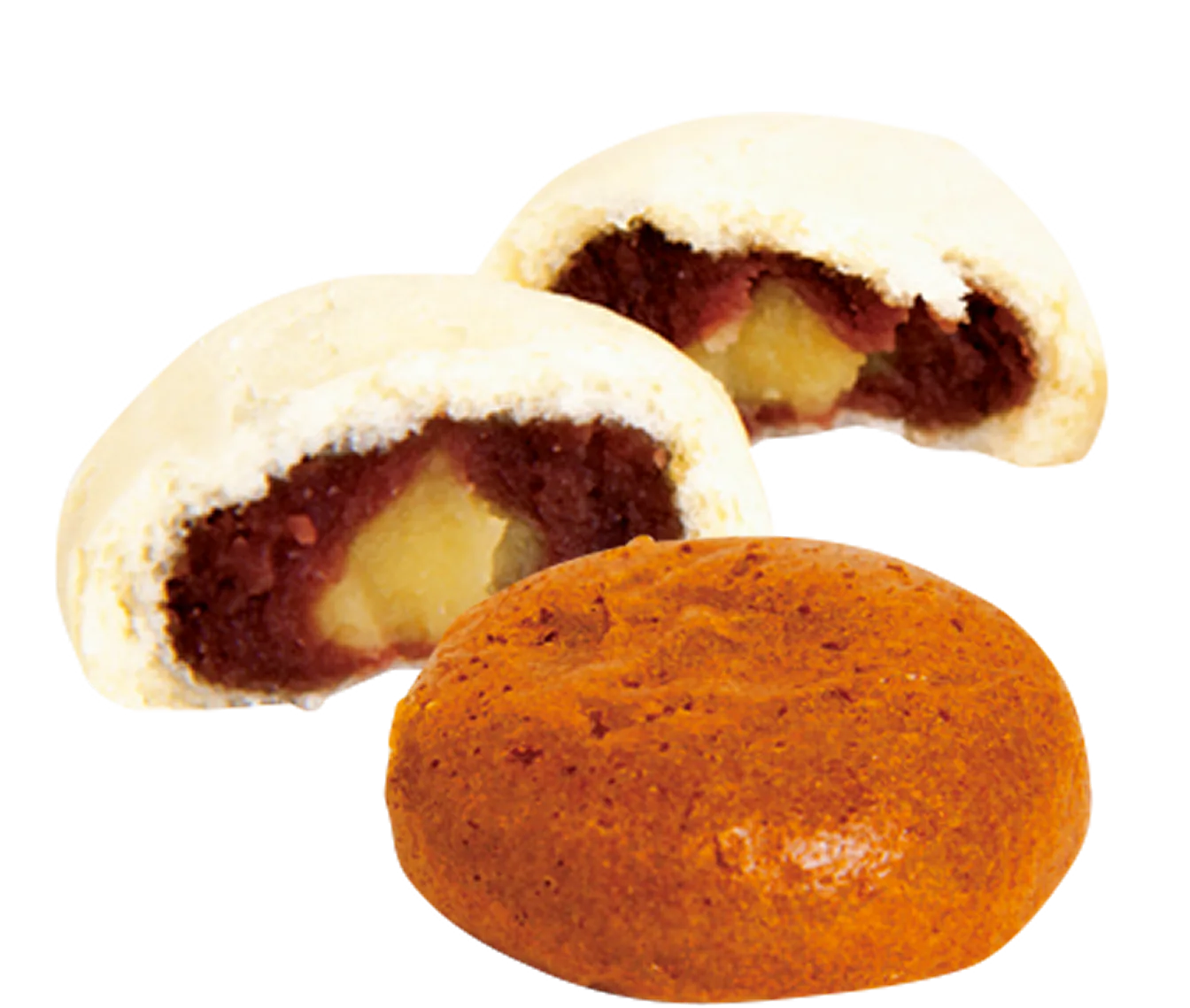 2色の餡が入った白いまんじゅう(上)がメインで、 茶色いつぶ餡タイプ(下)もあり