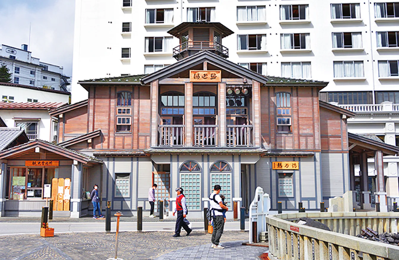湯畑の周辺は公園のように整備され、御座之湯、熱乃湯などの施設が立ち並ぶ。食べ歩きグルメも楽しい。