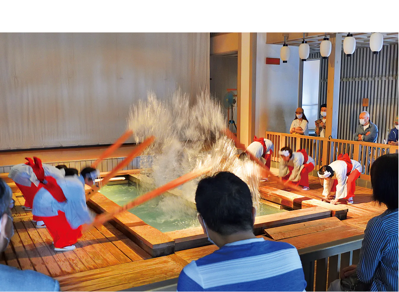 湯もみ実演。長さ約180㎝もある大きな板で豪快に湯をもむ
