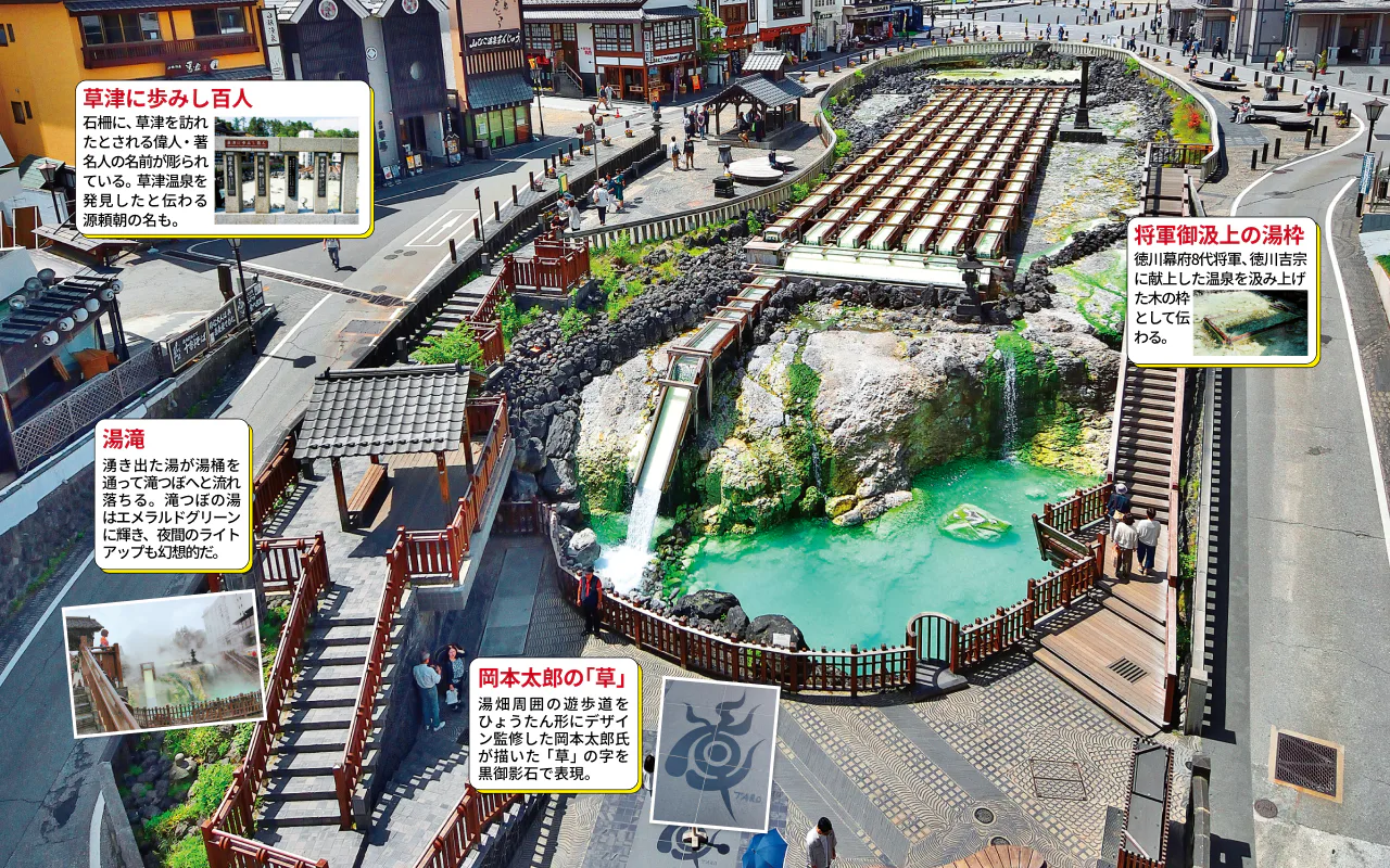 湯畑は、草津温泉の6大源泉を代表する源泉。毎分約4000ℓの温泉が自然に湧き出し、湯けむりが漂っている。周囲は公園のように整備され、観光スポットや飲食店、みやげ店などが集まっている。