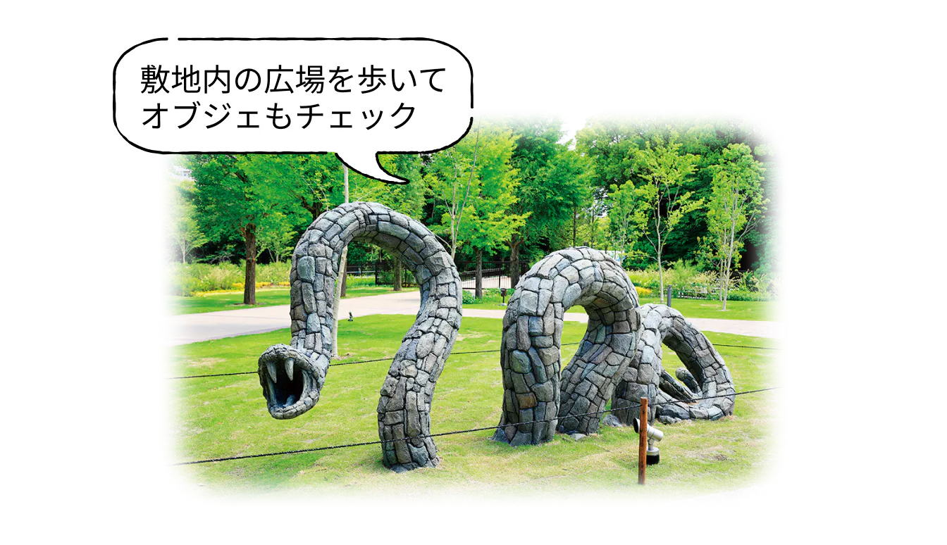 自然を生かした広場には散策コースが整備されている。フォトスポット満載なので、のんびり散歩しながらオブジェと記念撮影を!