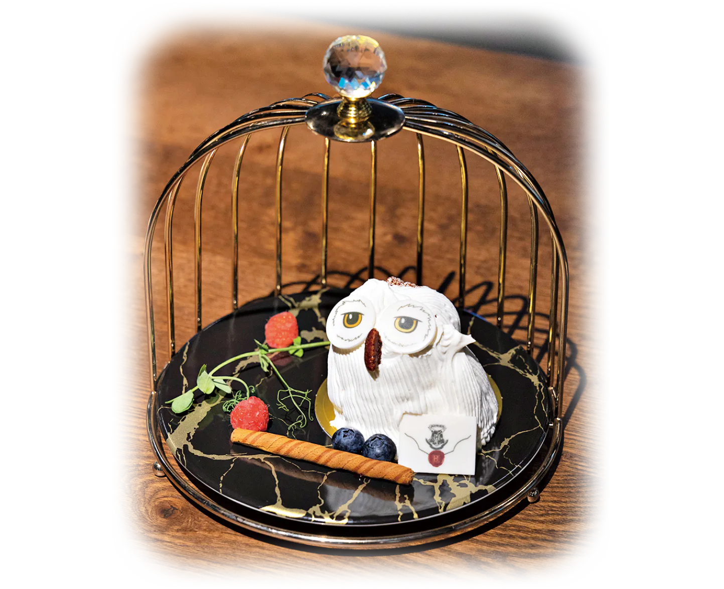 ヘドウィグケーキ1600円。ヘドウィグはハリーの相棒。3種のクリームをスポンジでサンドしたキュートなケーキ