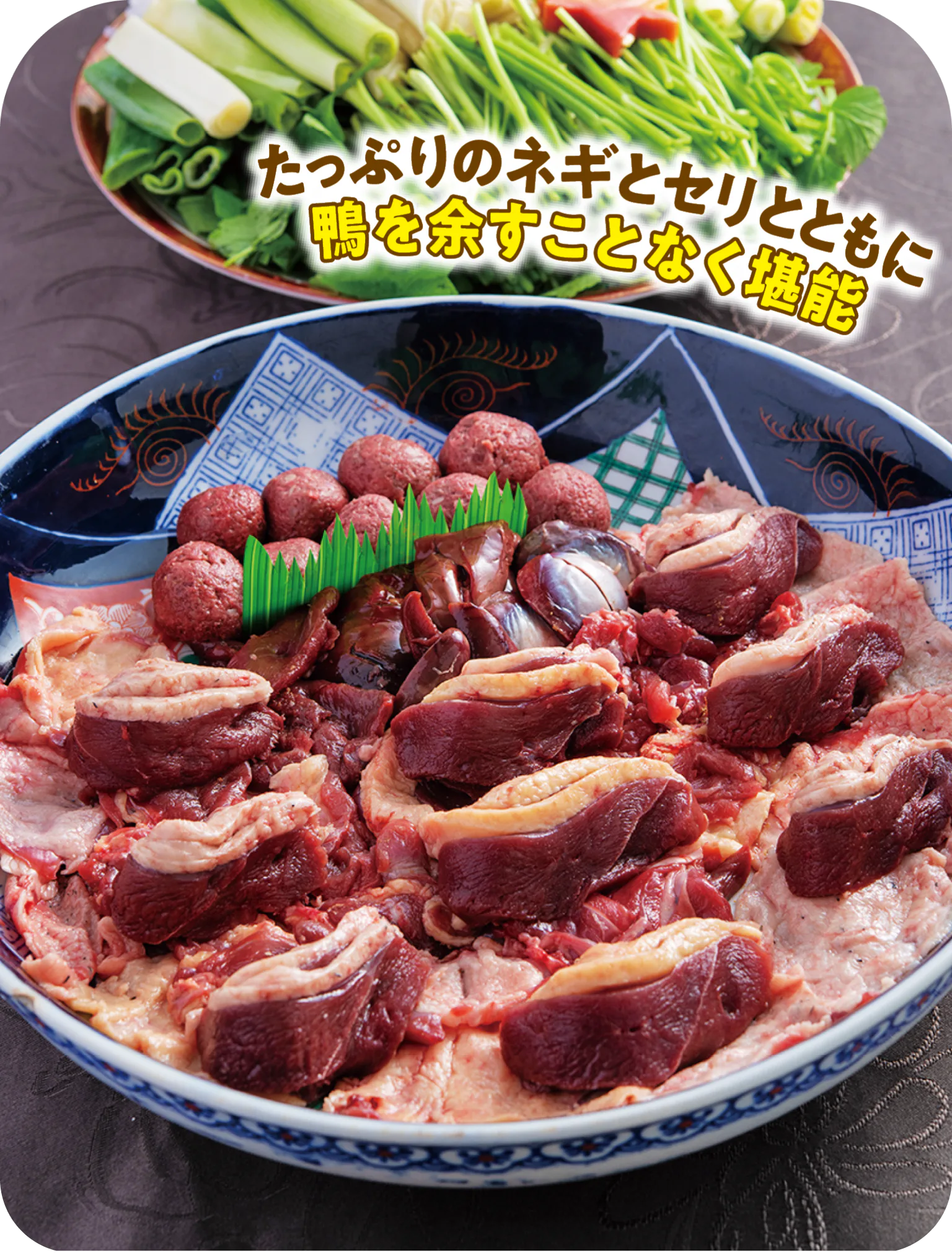 天然真鴨の中で最も美味とされる「青くび」の鴨を使用。肝、バラ、つくね、ロースで異なる食感が楽しめる
