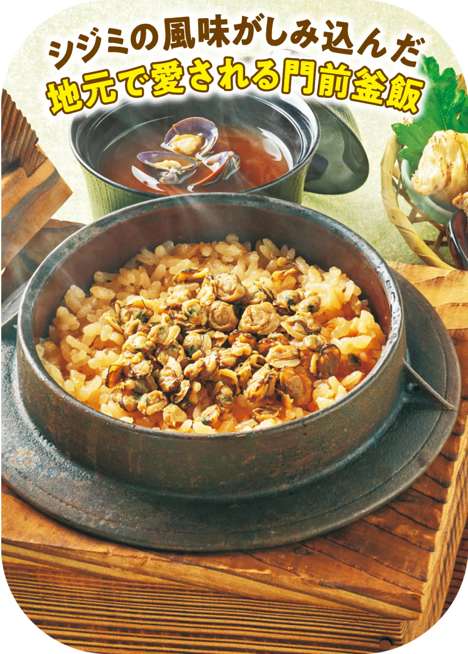 縄文時代から近郊でセタシジミが食されており、びわ湖南部や石山寺周辺では今も名物。注文後に炊き上げるシジミのうま味とおこげの香ばしさが調和した釜飯は絶品だ。石山寺の門前にあるので参拝前に予約し、帰りに立ち寄るのがおすすめ。