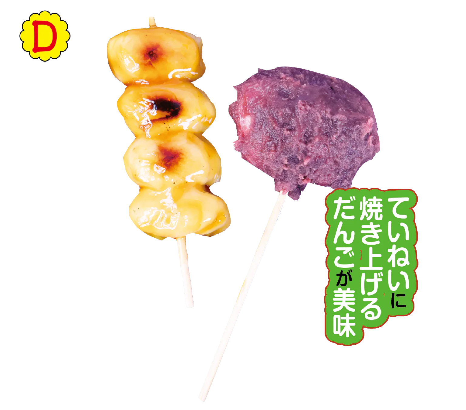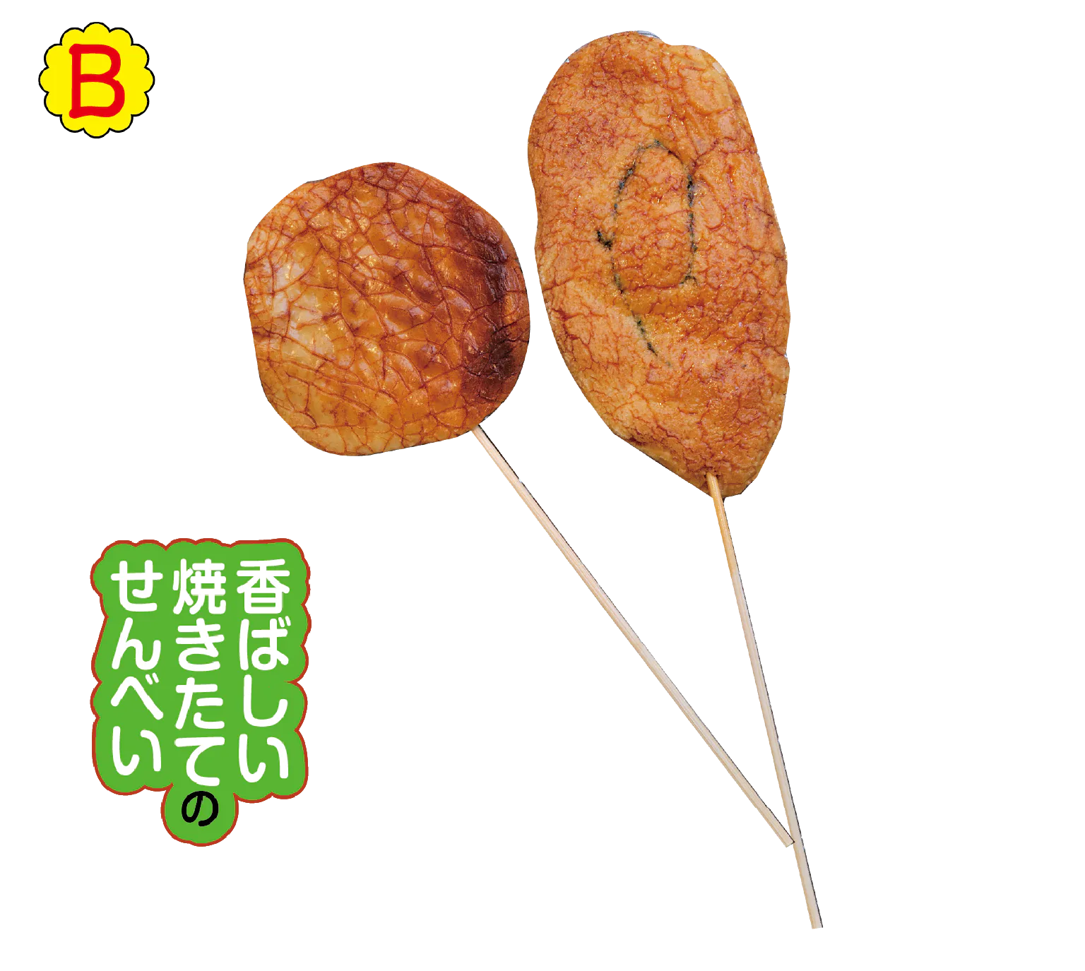見た目もかわいい串刺しのせんべい。割れ目が特徴のしょうゆと、青のりがポイントのみたらしの2種類を用意