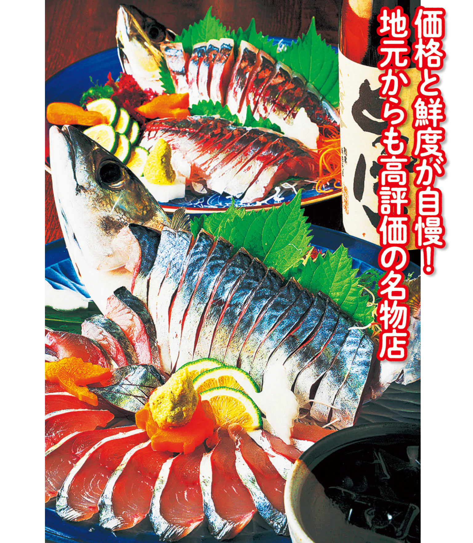 鮮魚店が営む食事処。九州近海でとれる天然ものを店主が自ら市場で仕入れ、その日のうちに使い切る。そんな鮮度のよさと、鮮魚店ならではの高コスパで定評がある。「関さば・関あじもほかより2~3割は安い」と店主。取材が絶えない人気店だ。
