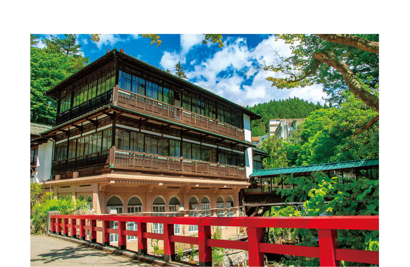 国登録有形文化財の「積善館」をはじめ、木造建築の由緒ある旅館、昔懐かしい遊技場やみやげ物店が立ち並ぶ。