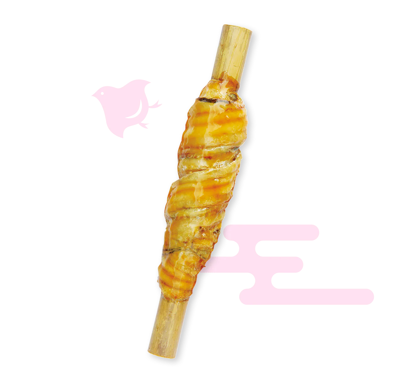 三枚に下ろしたタチウオの身を竹に巻き付けて焼いたもの。甘ダレなど4種の味がある