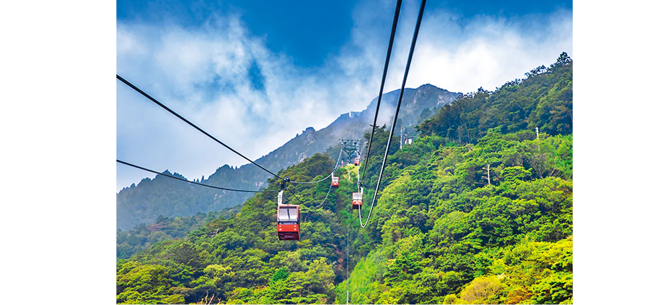 鈴鹿山脈の主峰・御在所岳の麓には、歴史ある湯の山温泉街が広がる。御在所ロープウエイに乗って、眼下に広がる絶景を