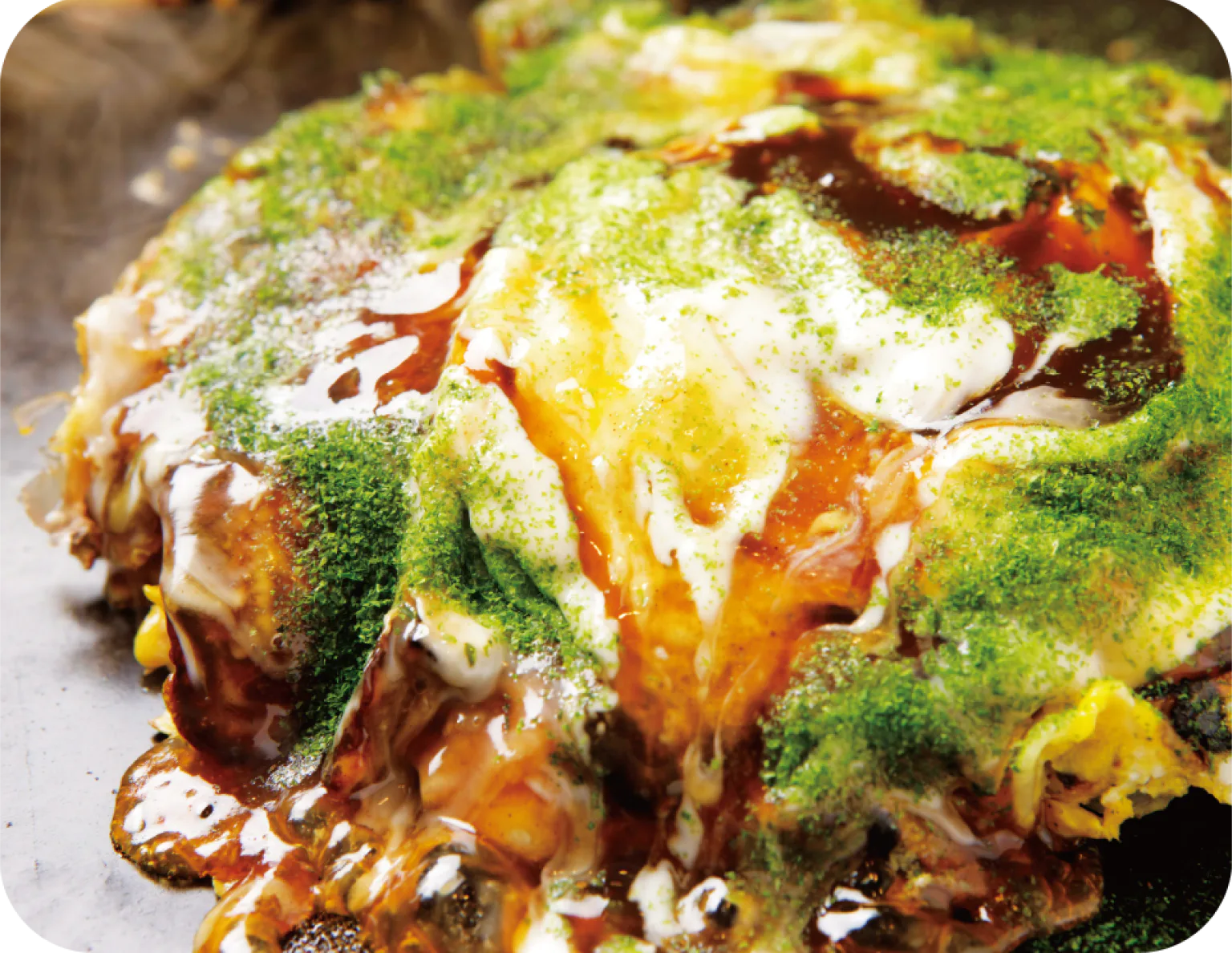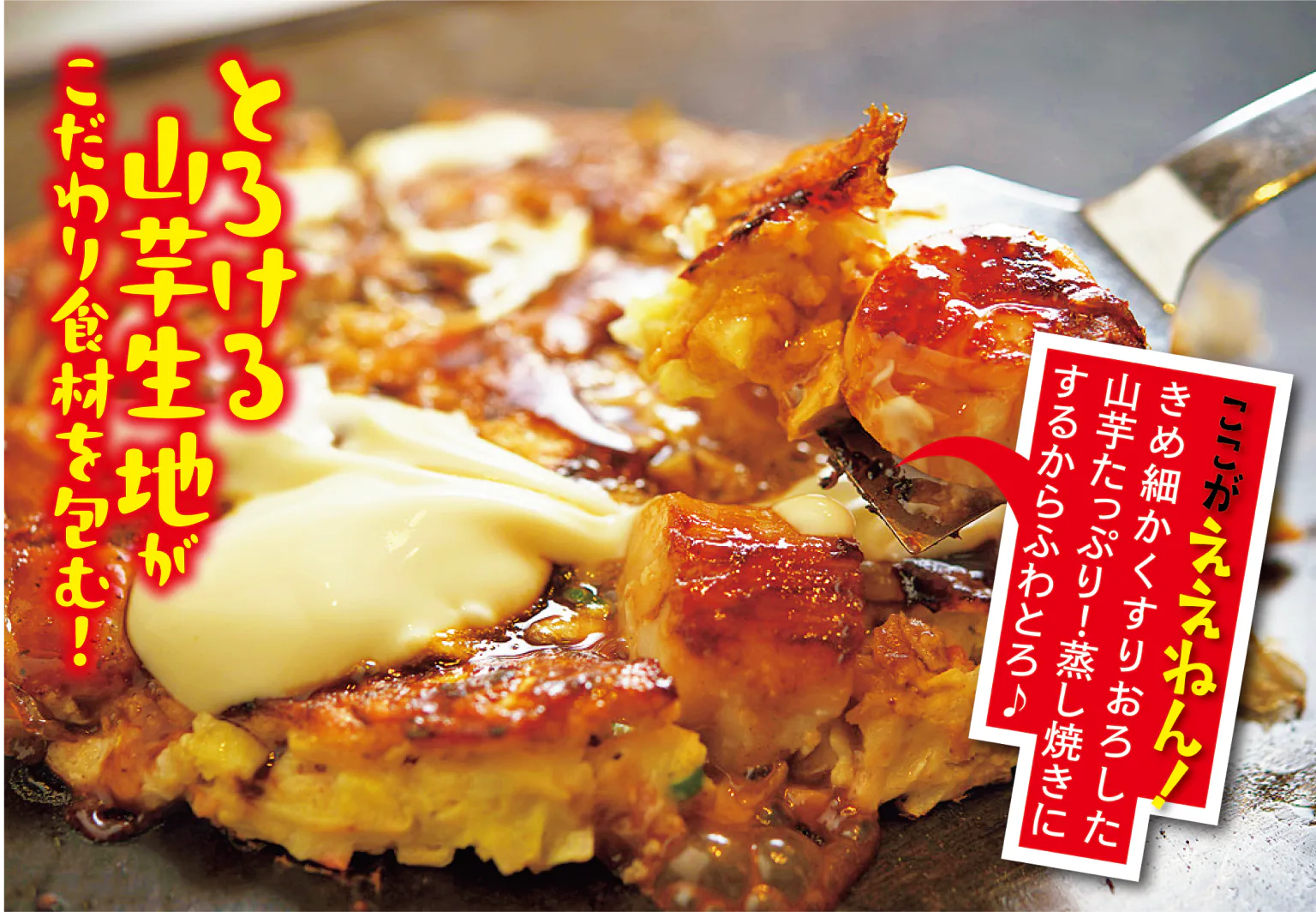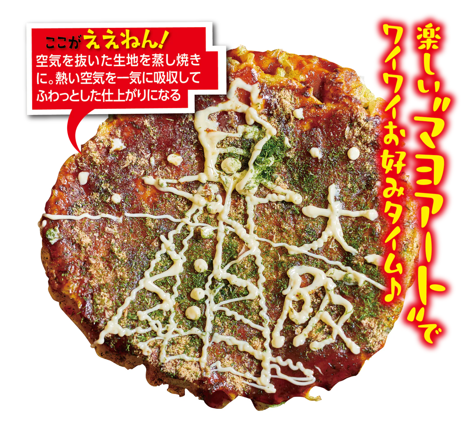 女将が約30年前に考案したマヨネーズアートで知られ、今やSNSでもおなじみの老舗。そのエンタメ感はもちろん、生地を押さえつけてから蒸し焼きにするふっくら軽い食感の味わいも好評。