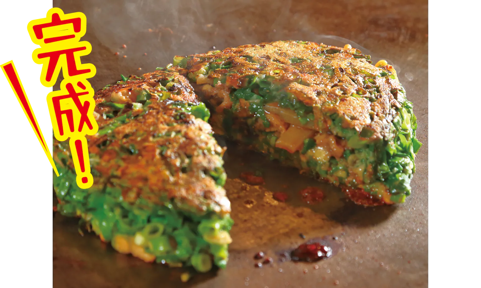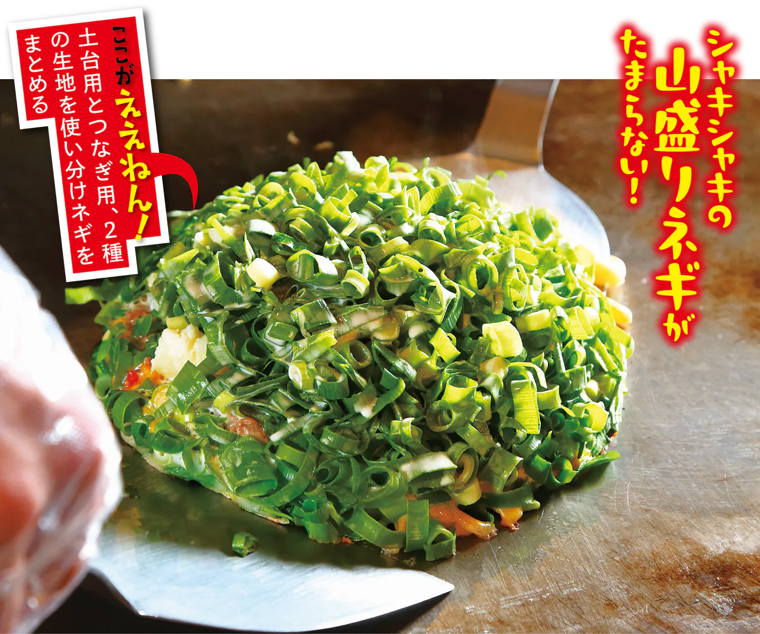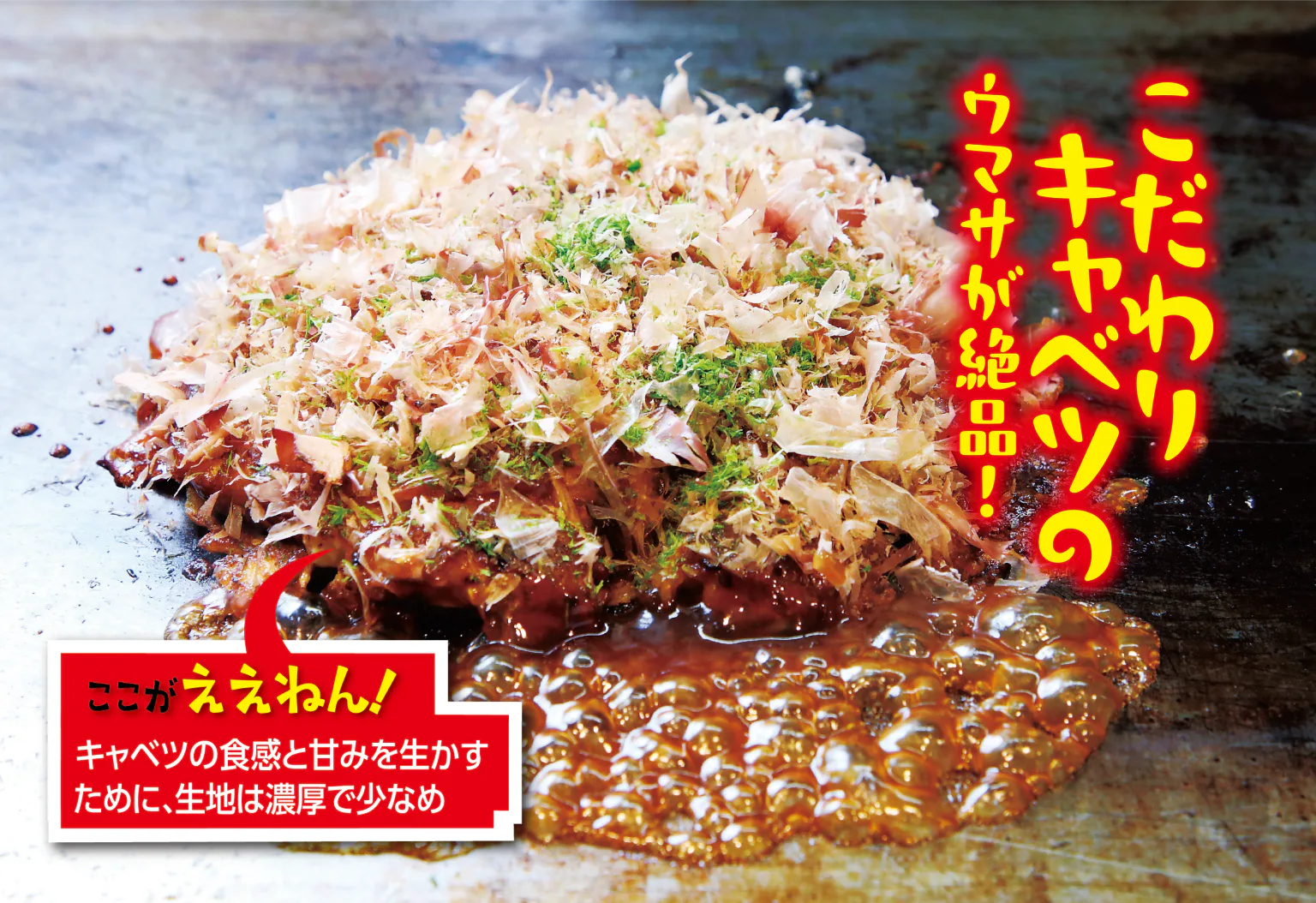 焼き上げるまで“絶対に押さえない”というこだわり製法で、キャベツの食感とみずみずしさを生かした絶品の一枚を作る。仕上げにピリッと利かせるカラシが絶妙なアクセント。