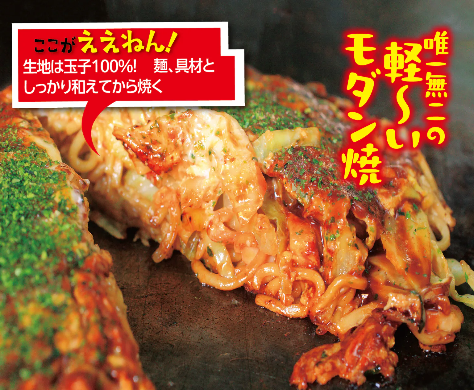 JR大阪駅周辺で随一の人気を誇る実力派。通常、モダン焼きはお好み焼にそばを加えて焼くが、生地に粉を使わない「ほぼオムそば」スタイルで提供。ボリューム控えめで女性のリピーターも多い。