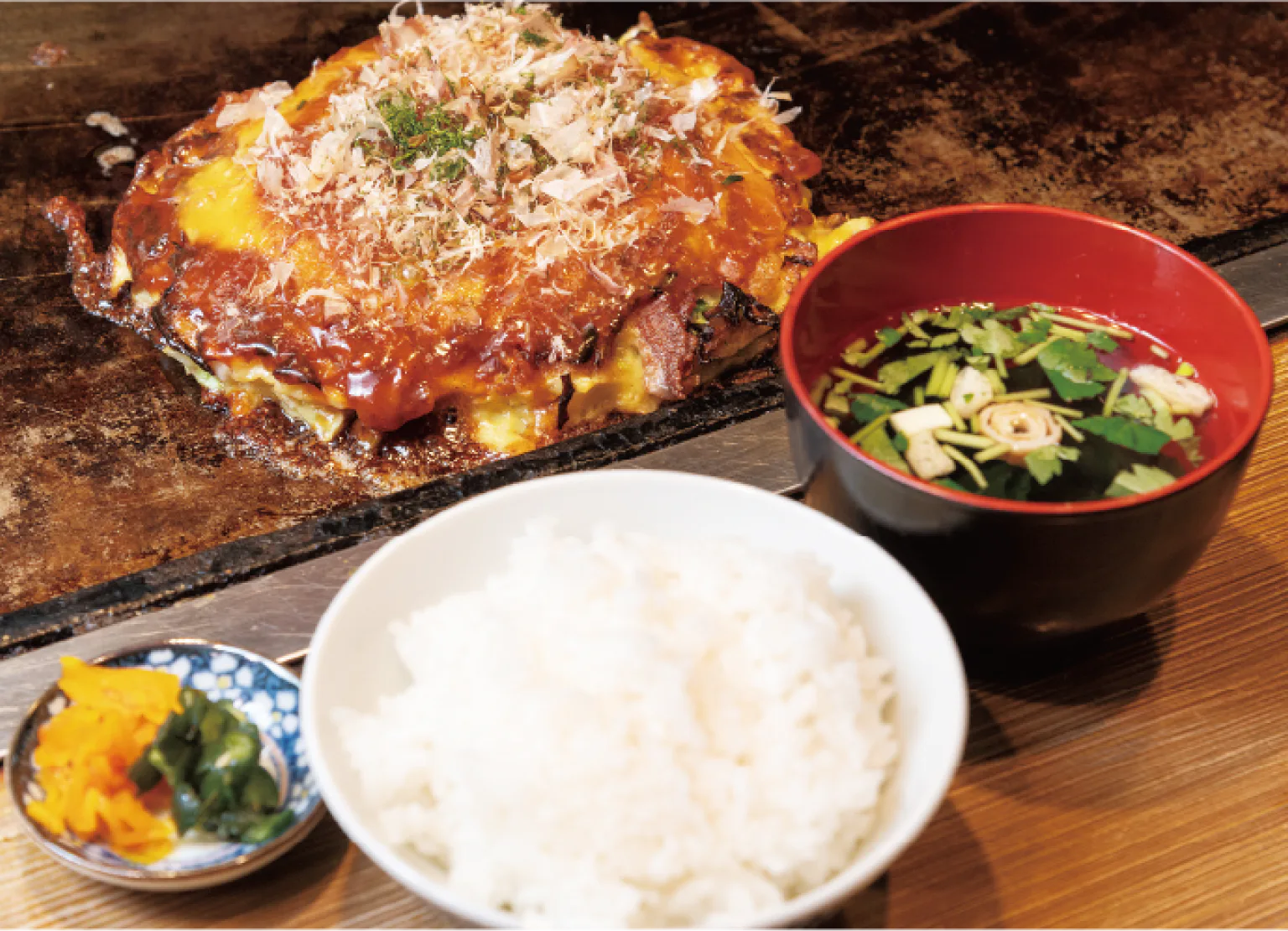 大阪人はお好み焼とご飯を一緒に注文する人も多い。ソースの風味にご飯も進む。定食セットを扱う店も。