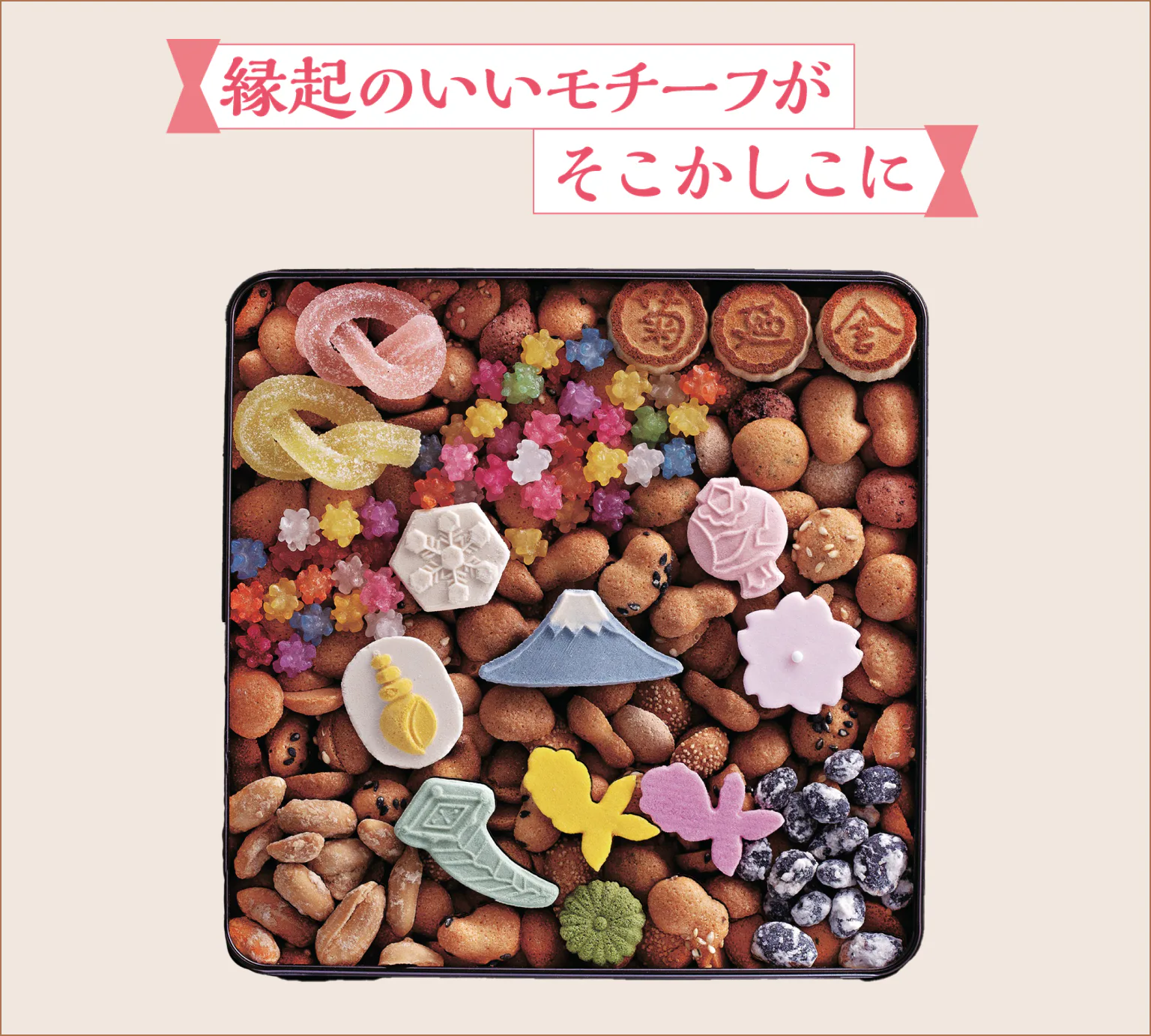 金平糖や落雁など、かわいらしい江戸菓子が20種類以上も詰まった品。予約すれば菓子にオリジナルメッセージ(1枚108円)を入れられる。※パッケージや詰め合わせ内容は変更になる場合あり