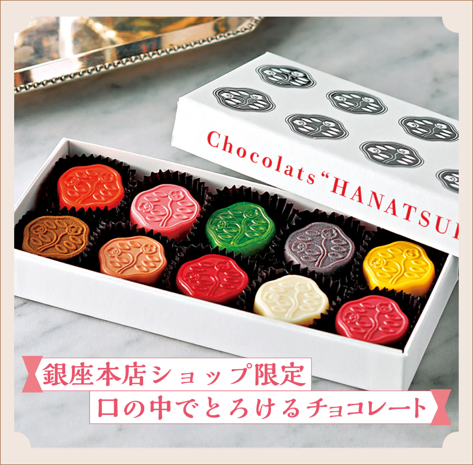 資生堂のシンボル「花椿マーク」をかたどったカラフルなボンボンショコラ。カフェ、アールグレイ/パッション、カシスなど定番のほか、季節限定のフレーバーも。