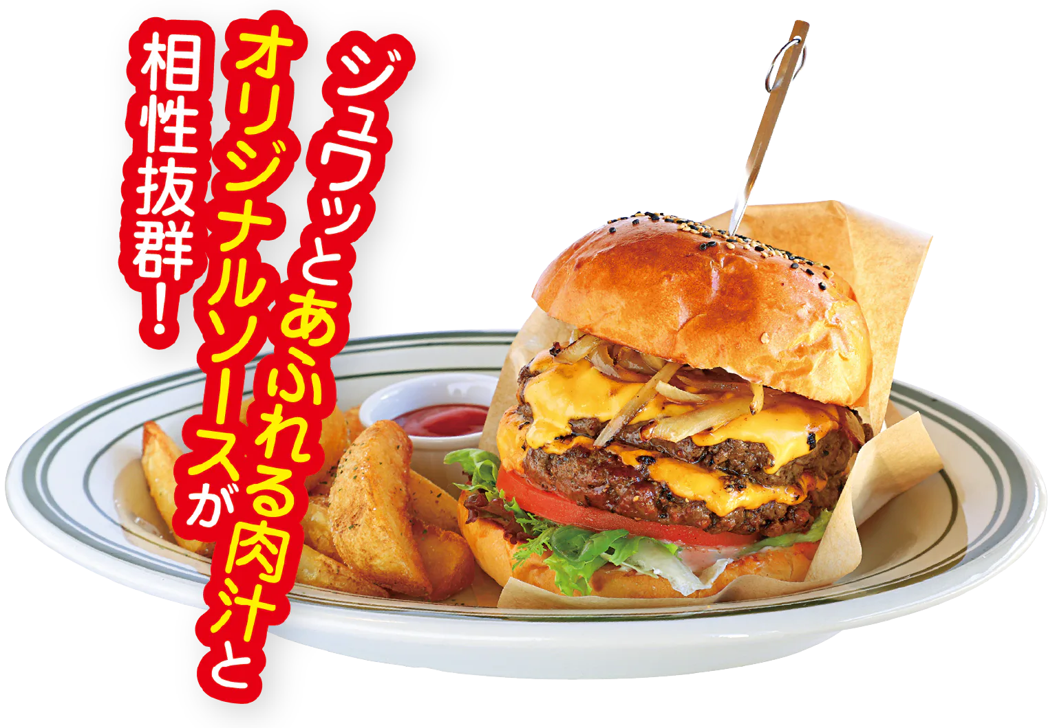 牛肩ロース100%を使用したパティは歯ごたえもしっかり。オニオンのシャキシャキ感もアクセントに