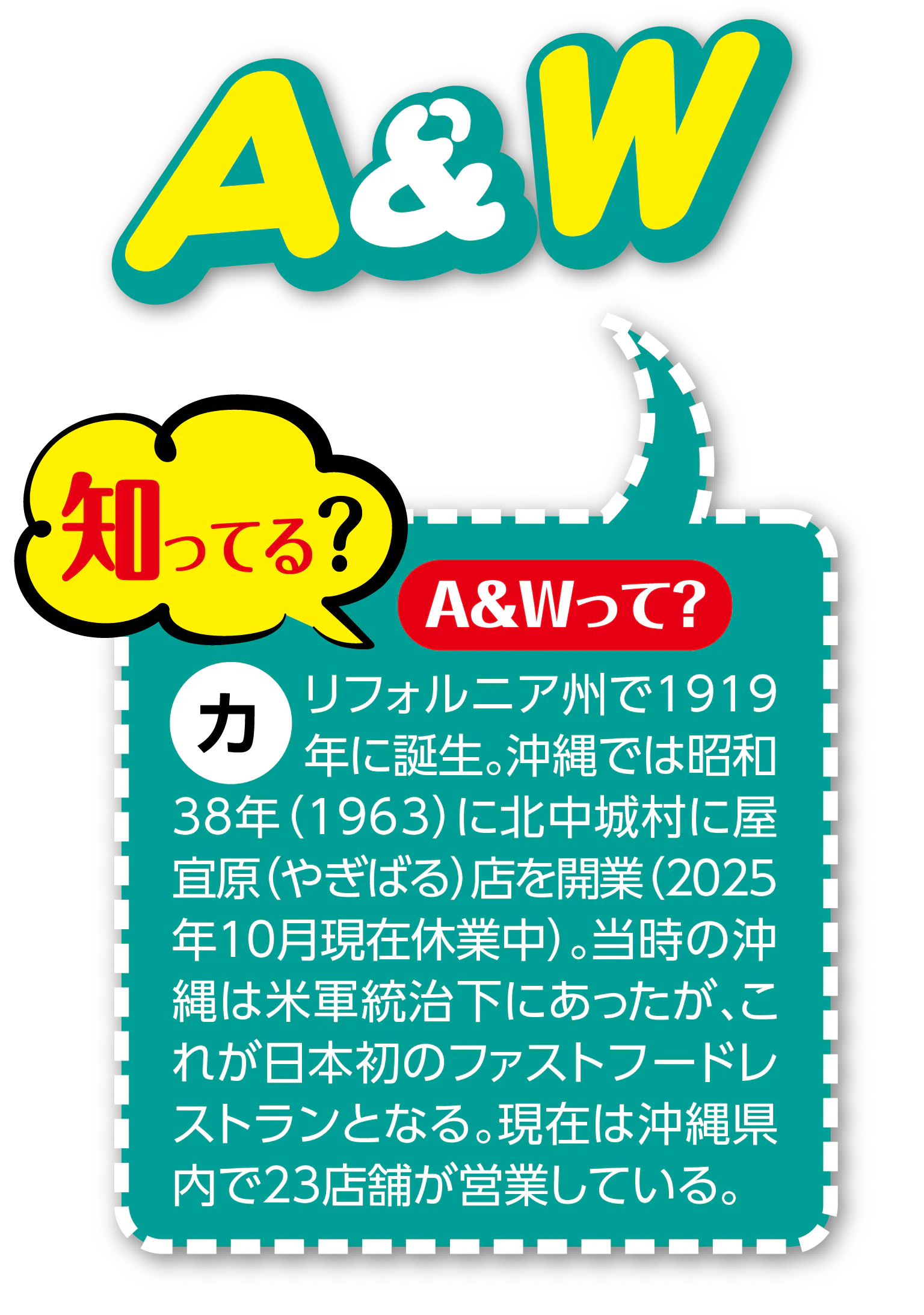 屋宜原店に次いで昭和44年(1969)に開業。国道58号沿いという立地のよさと、広い敷地をもつことから沖縄のA&W代表店舗となっている。ジャガイモの粉末を成型して揚げたカーリーフライ(R)430円やルートビアはぜひオーダーしたい。