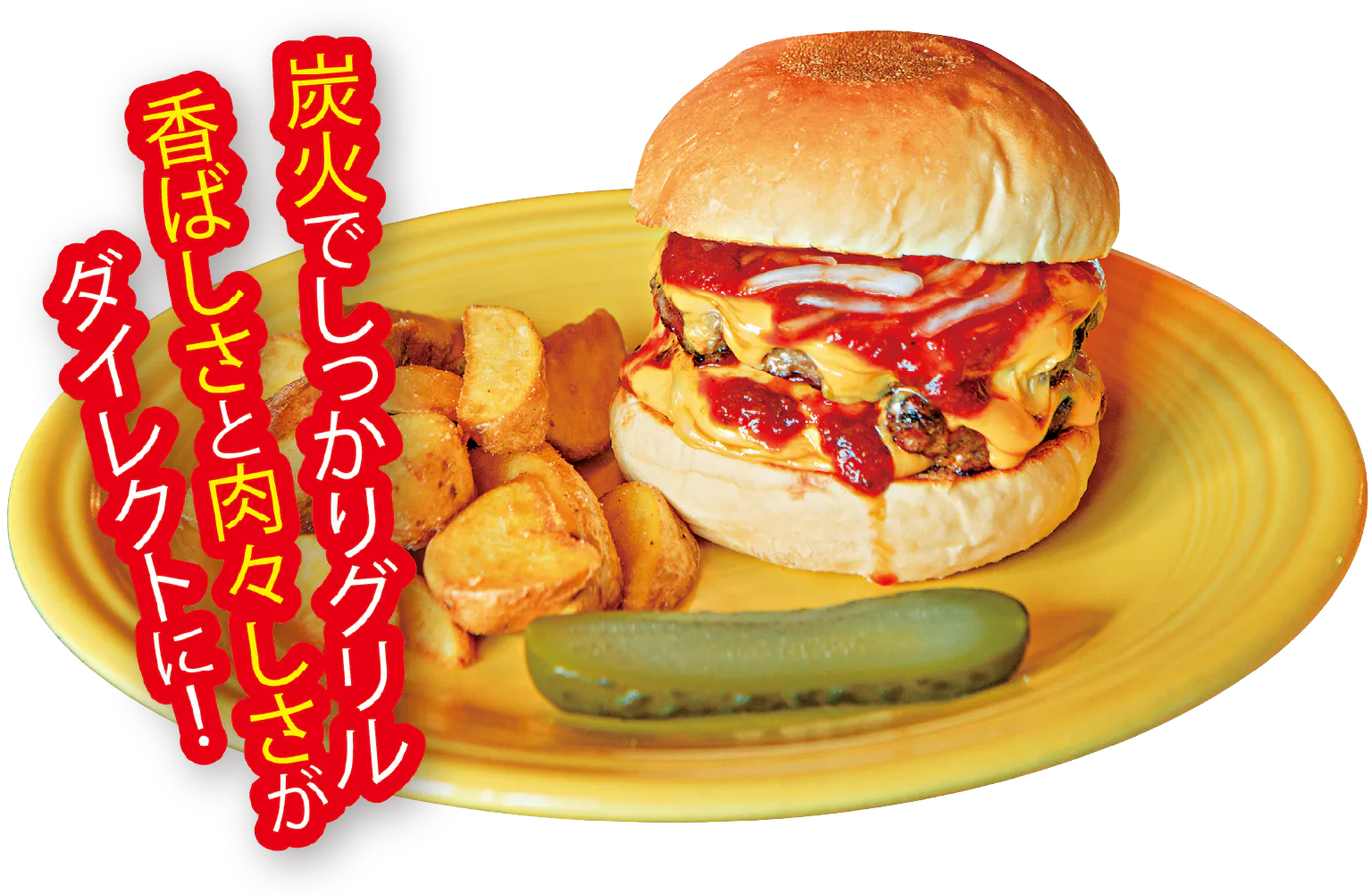 カラフルでポップな店内は1950年代のアメリカの田舎町のバーガーショップをイメージ。バンズは自家製。パティはビーフ100%で粗めに挽き、炭火で焼き上げているため香ばしさが後を引く。カウンターからテーブル席までどこをとってもアメリカン。