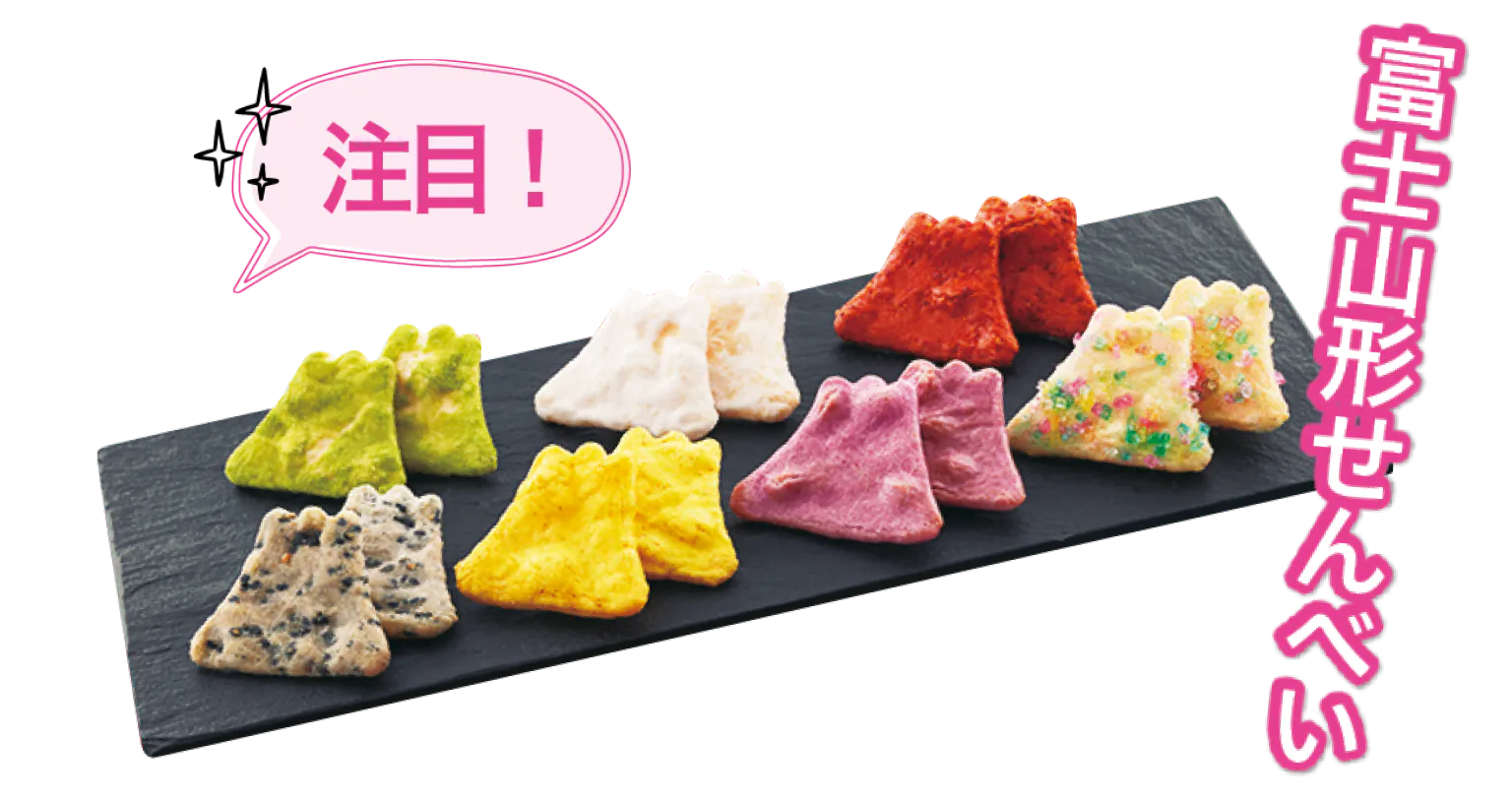富士山をかたどった一口サイズのせんべい。夕暮れをイメージしたむらさきいも味や、冬の富士山をイメージした白砂糖味など、7つのフレーバーのセット