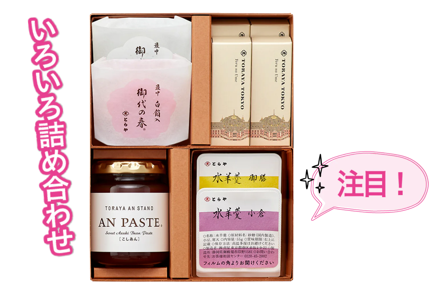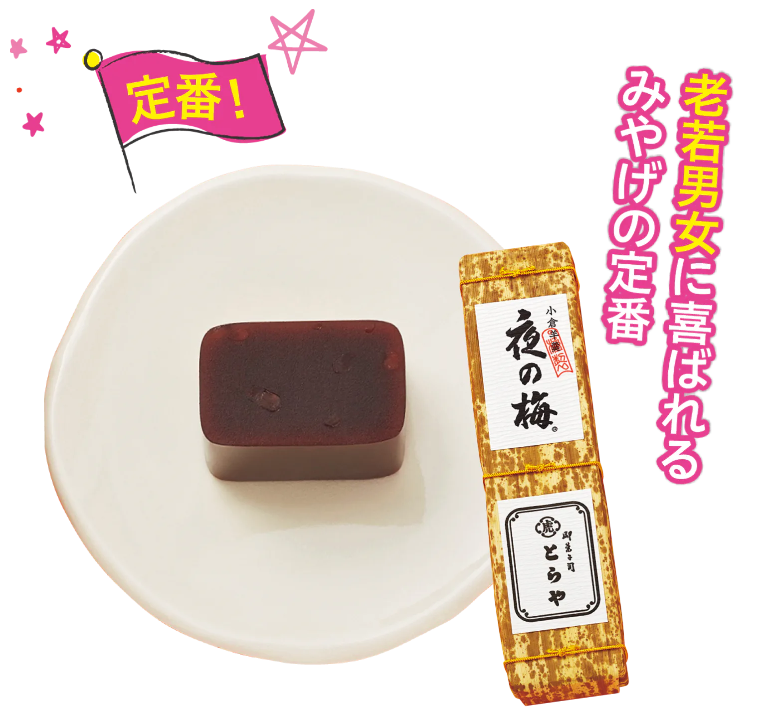 切り口の小豆を夜の闇に咲く梅の花に見立てて命名された、とらやの代表商品。1本の竹皮の中に、2本にわかれた中形ようかんを包んでいる。
