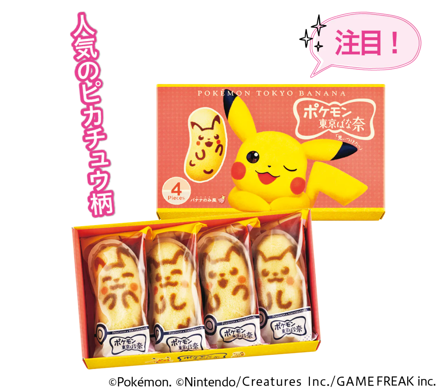 ふかふかのスポンジに全6種類のピカチュウの絵柄をあしらった東京ばな奈。かわいらしいパッケージにも注目。※お菓子の絵柄はランダム