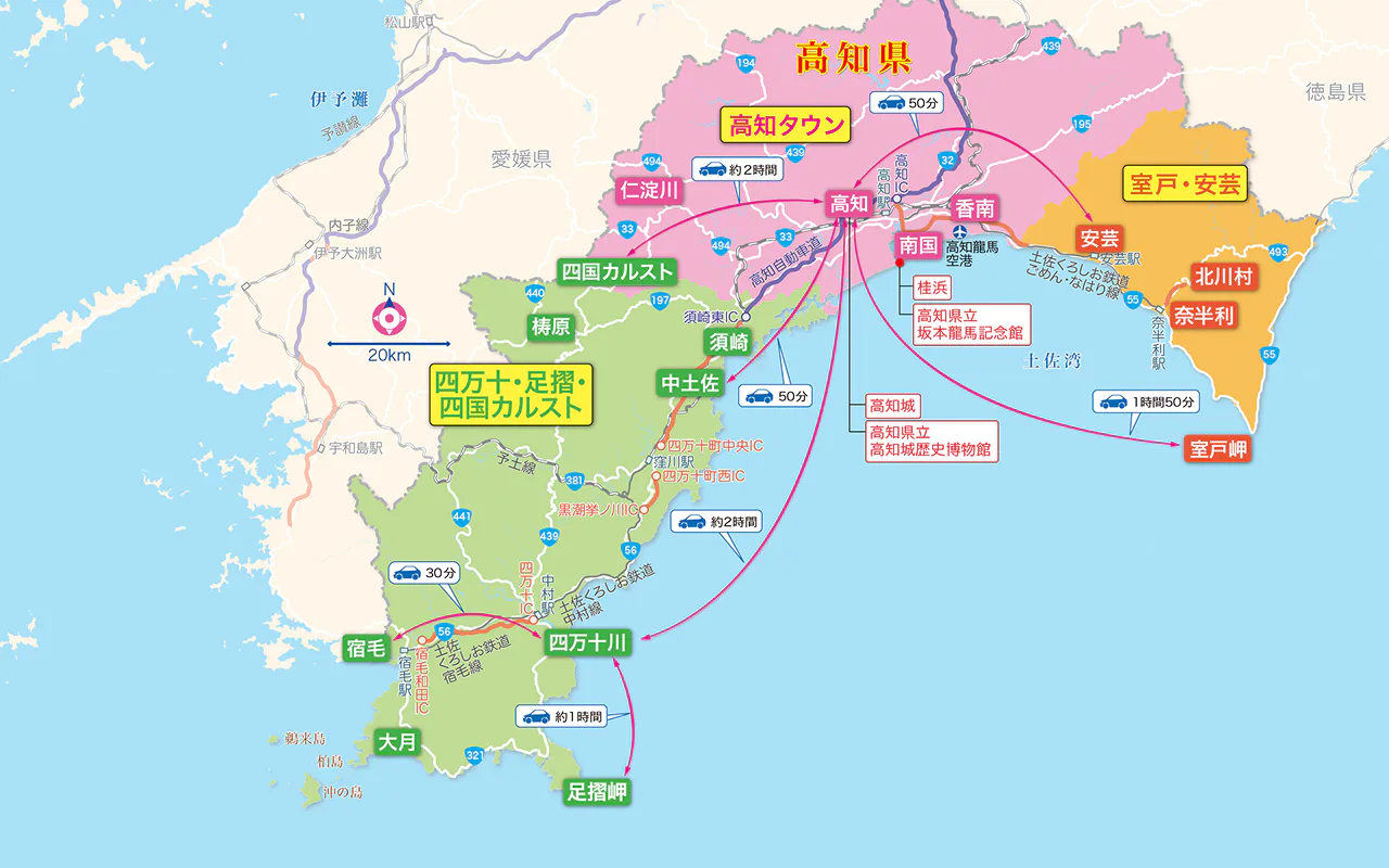 南は太平洋に面し、北には四国山地が広がる高知県。大きく3つのエリアに分けられ、高知タウンが旅の拠点となる。足摺岬など遠方へ向かう場合は時間に余裕をもってプランを組もう。