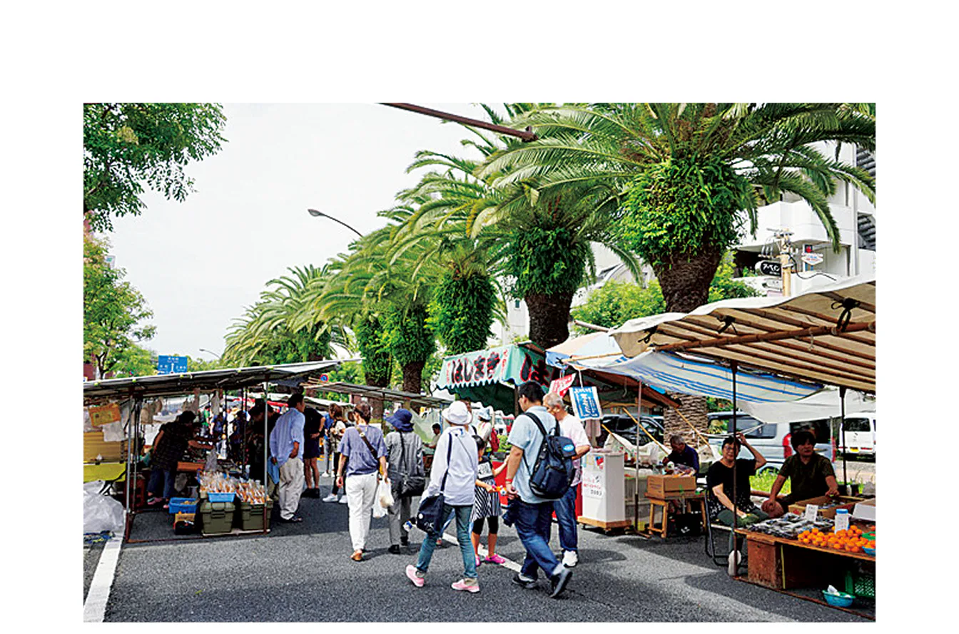 日曜市では、高知産の旬の青果や菓子がずらりと並ぶ