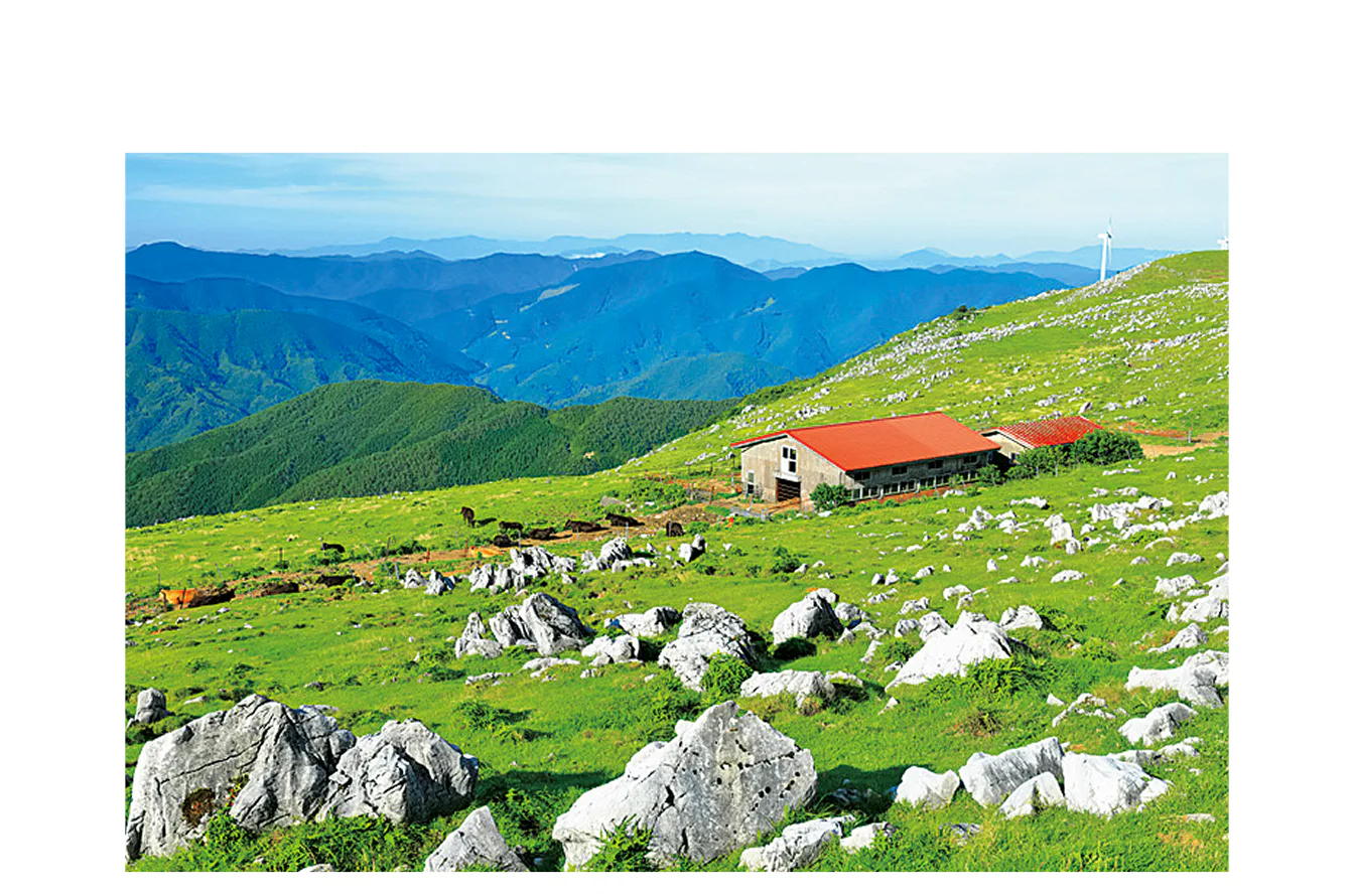 愛媛県との県境にまたがるカルスト台地。牧歌的な風景が広がり、「日本のスイス」とも称される