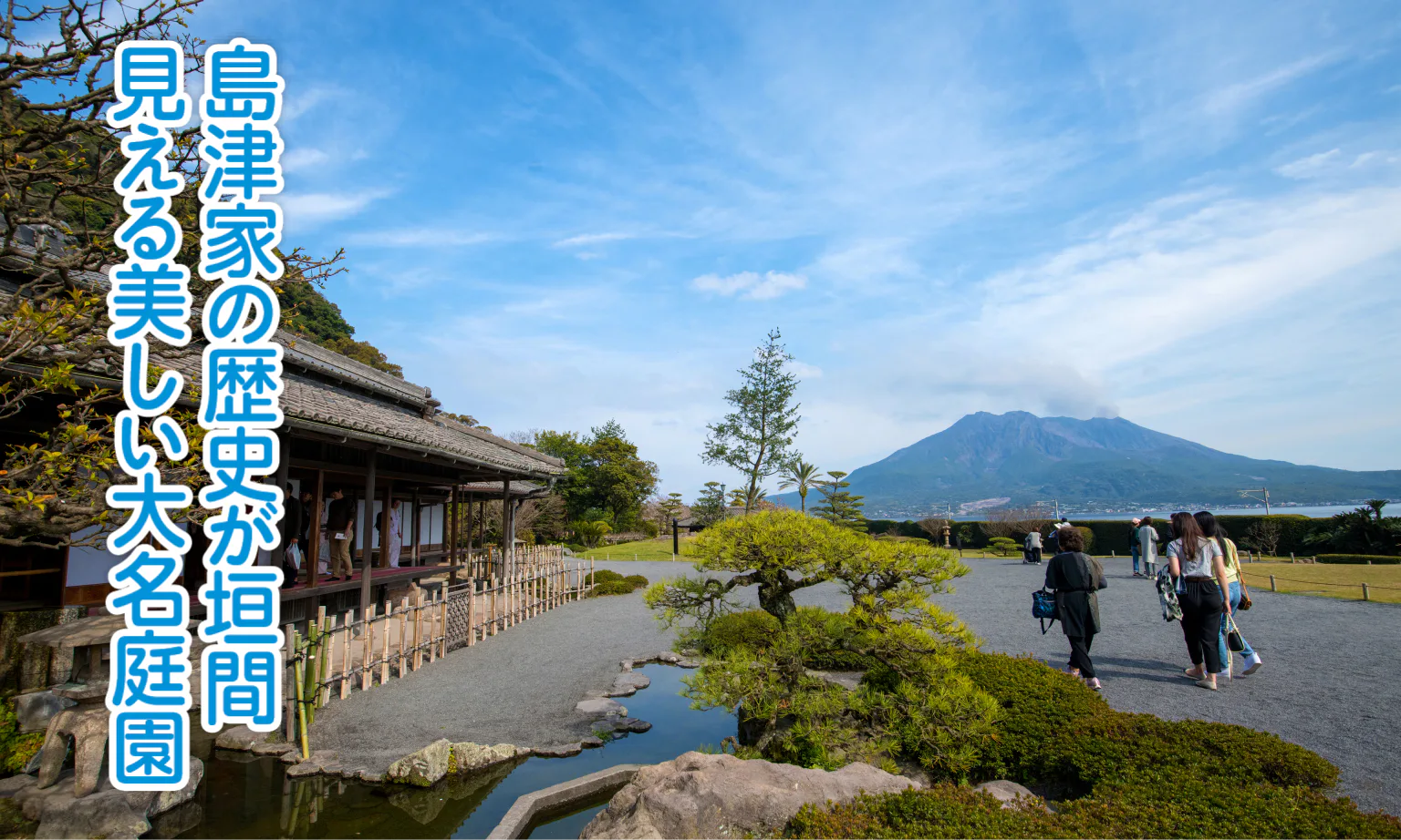 島津家19代の光久が構えた風光明媚な庭園。敷地内には明治の産業革命遺産も点在しており、なかには世界遺産の構成資産に登録されている旧集成館反射炉跡などがある。