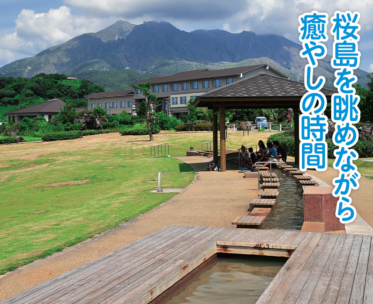 全長約100mの長い足湯。後ろには桜島、前方には鹿児島タウンを眺めながら、ゆったり源泉かけ流しの天然温泉が堪能できる。