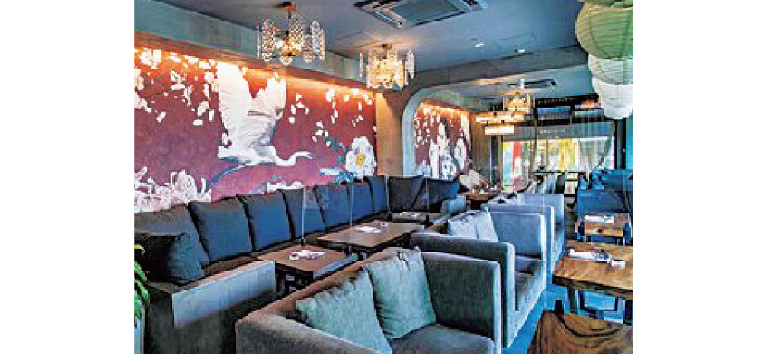 レトロモダンな店内にはイラストレーター黒木仁史氏が描き下ろした巨大な壁画が。店内からは道後温泉駅の駅舎や坊っちゃん列車などが眺められる。
