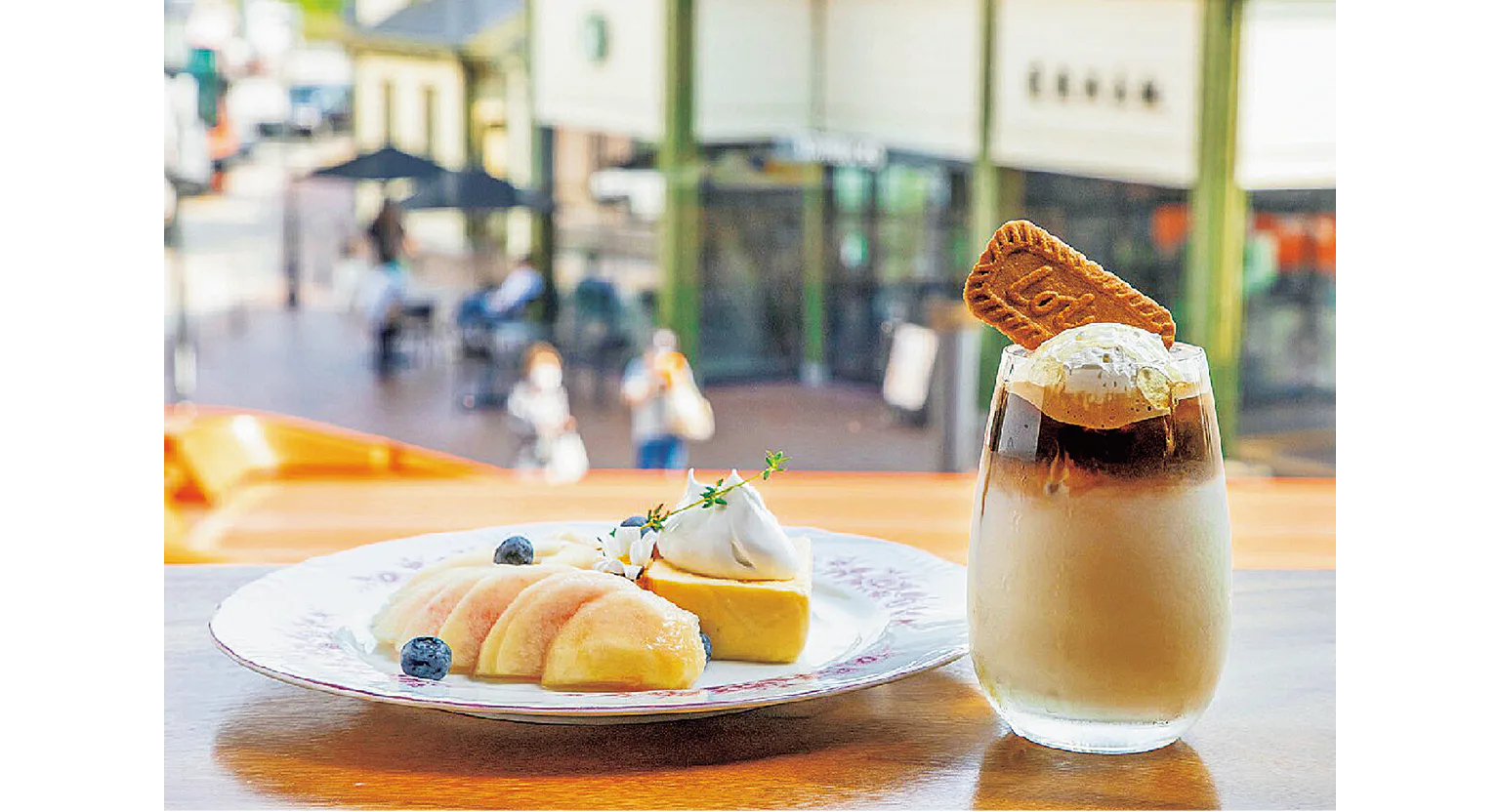 季節の果物を添えた自家製チーズケーキ(果実量たっぷり)1480円と金木犀のハニーラテ700円