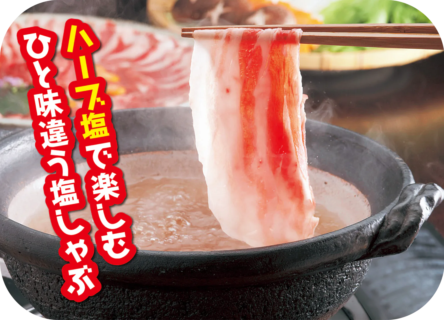 厳選された黒豚を使った人気の塩しゃぶしゃぶは、素材にこだわった天然だしつゆにくぐらせほんのり下味がついた肉を桜島小みかんなどの6種のハーブ塩で味わう。