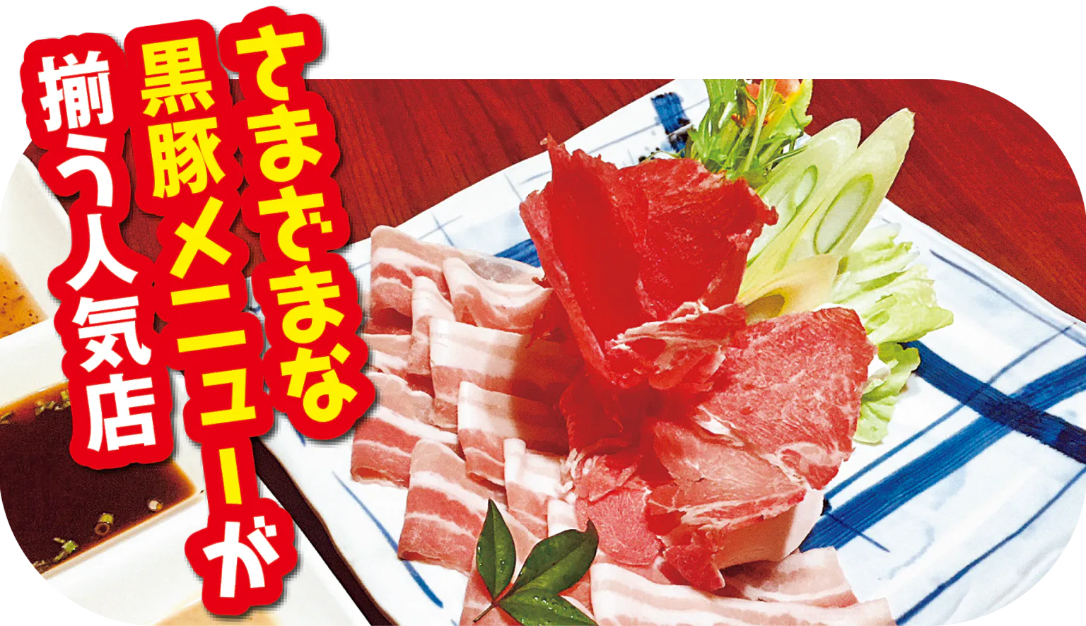 黒豚料理が豊富に揃う黒豚の専門店で、とんかつや鍋料理などのメニューを楽しめる。しゃぶしゃぶはごまポン酢ダレ、和ダレ、塩ダレの3種のタレで味わうことができる。有名人の来店も多い人気店。