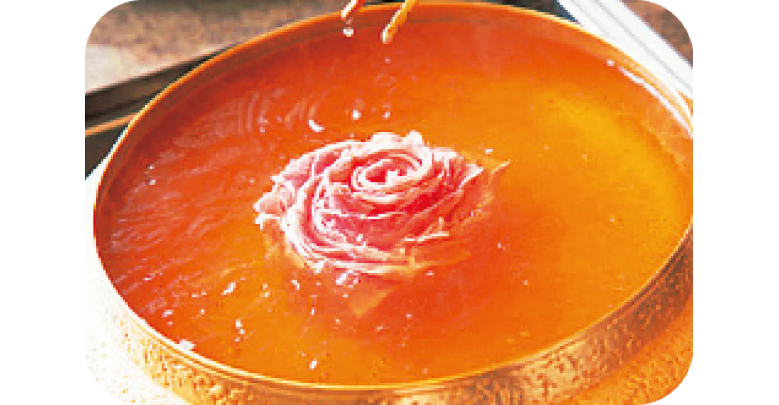➊まずは、中央に盛られたバラ肉を秘伝のだしにくぐらせて食べる