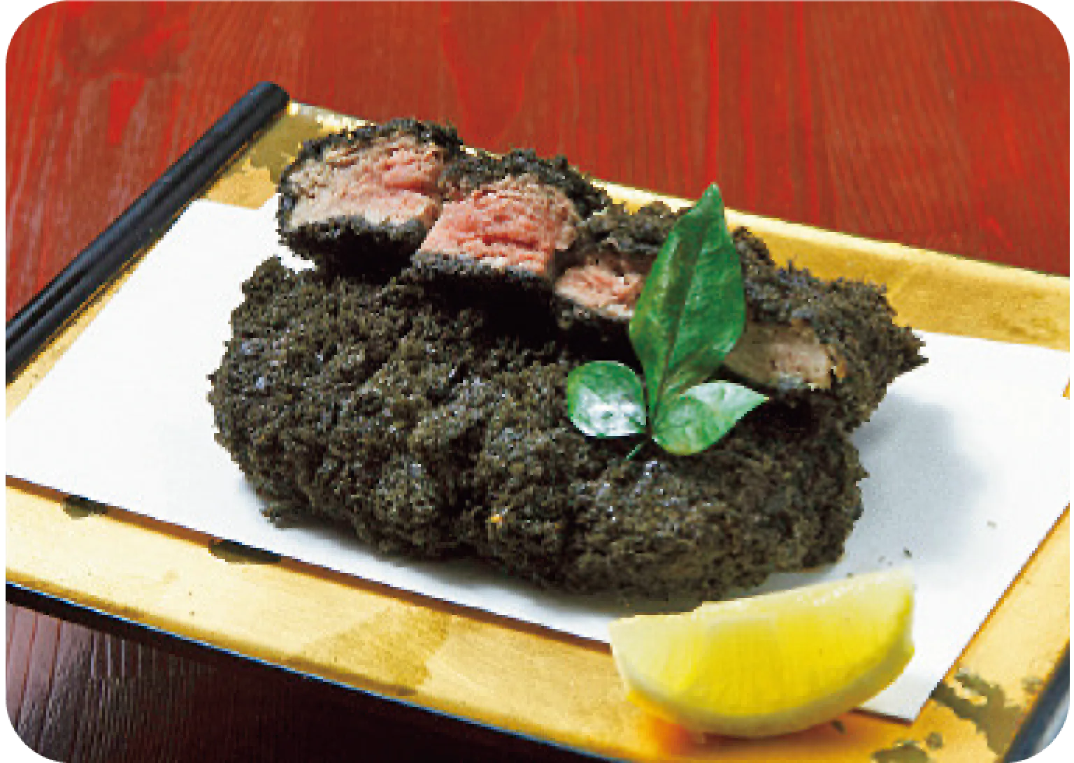 竹炭などの食材を加えた黒い衣はサクサクではなくザクザク。新食感のヒレカツだ