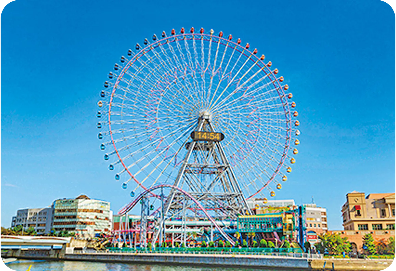 大観覧車「コスモクロック21」とYOKOHAMA AIR CABINのセット券は片道1700円、往復2500円(YOKOHAMA AIR CABIN窓口で販売)。大観覧車は時計機能付き。夜はイルミネーションが美しい。