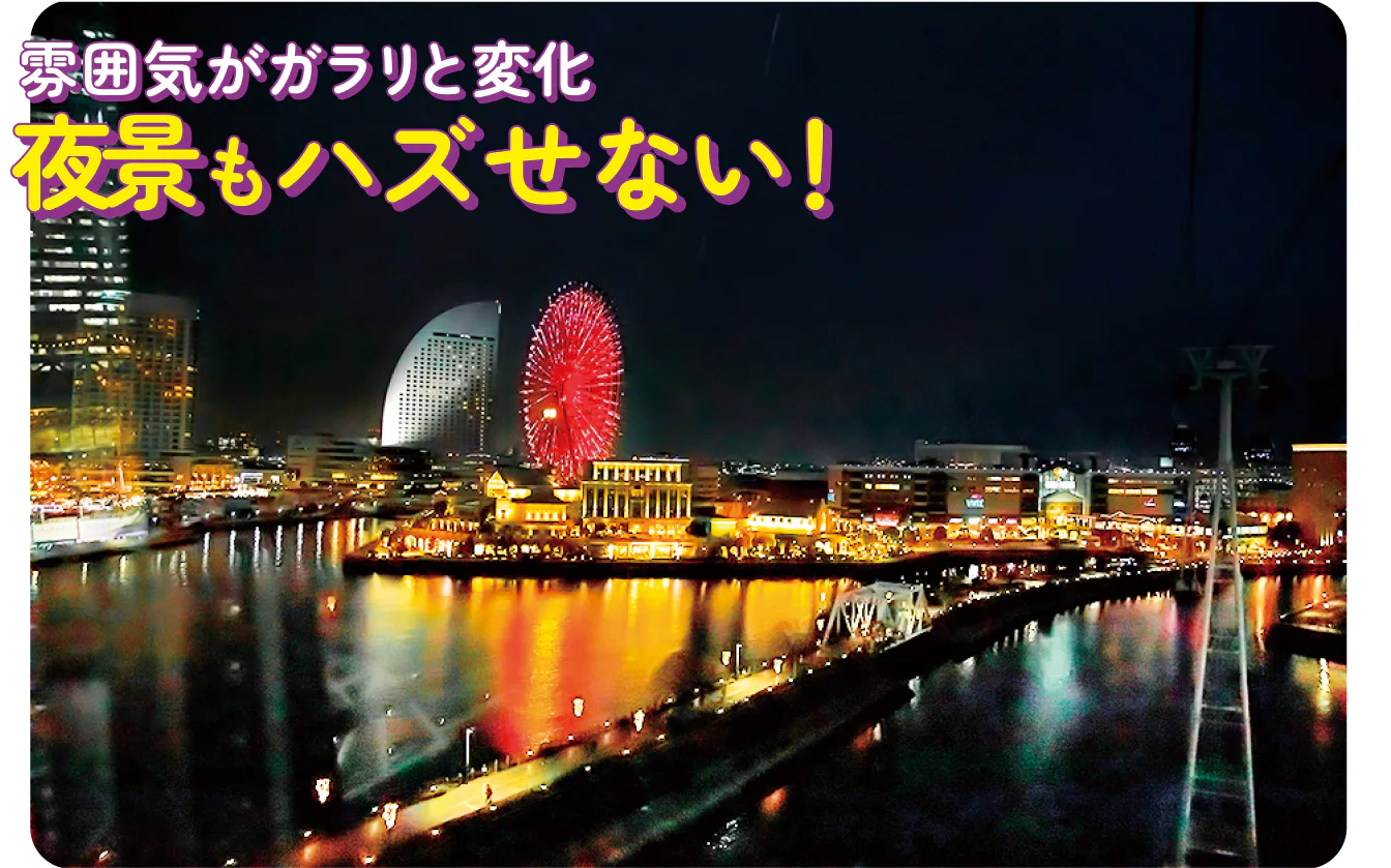 1日の締めくくりに夜景散歩はいかが?ライトアップされた汽車道やビル群がキラキラ輝く。空から眺めるみなとみらいの夜景は、いっそうロマンチック!キャビンのライティングは照明デザイナーの石井幹子氏が監修(写真下)。