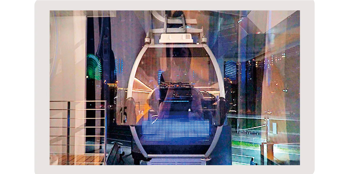 近未来的なデザインが特徴のキャビンには、1組ずつ乗車が可能で最大8人乗り