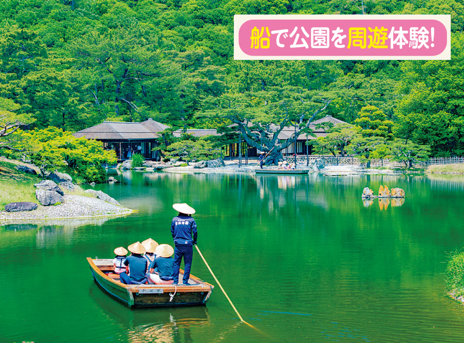 約30分かけて、南湖を和船で巡る。高松松平家の歴代藩主も愛した庭園を堪能しよう。杜鵑嶼(とけんしょ)にはハート形のツツジがある。