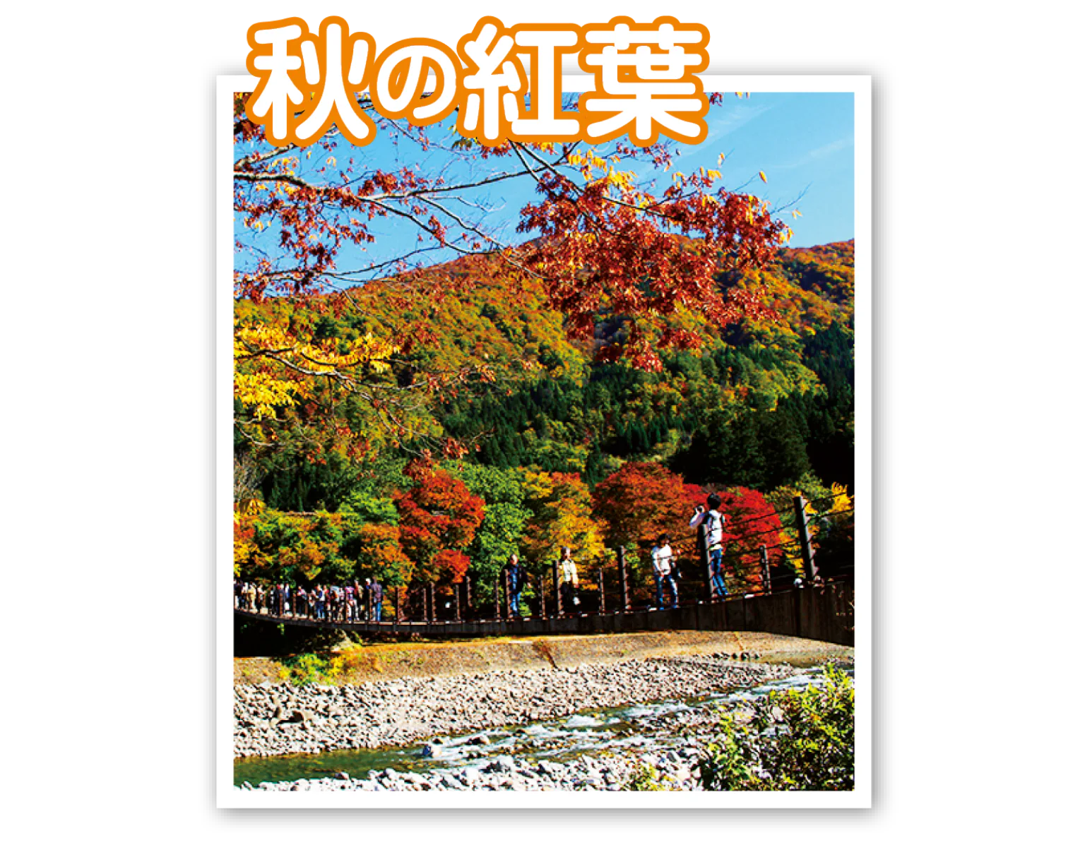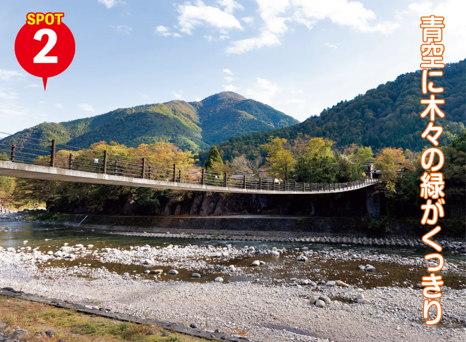 全長107mの吊橋。橋の下を流れる清流・庄川は、雪解けで水量が増す春から初夏に迫力満点の景観が広がる。河原に下りて、ひと味違うアングルを探すのもよさそう!