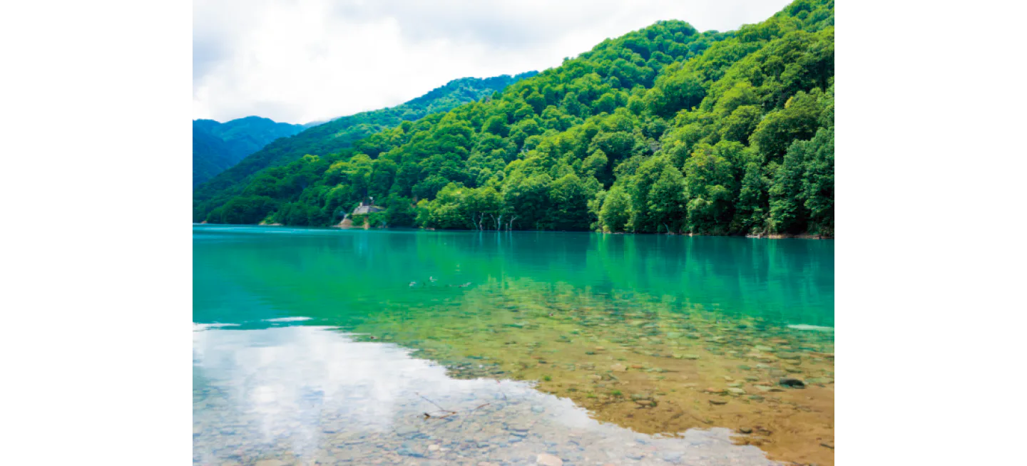 白山国立公園内にある湖。水中に硫黄成分が含まれているため、太陽光を反射し湖面がエメラルドグリーンに輝く。周辺に広がる雄大な緑の山々との共演も見事。