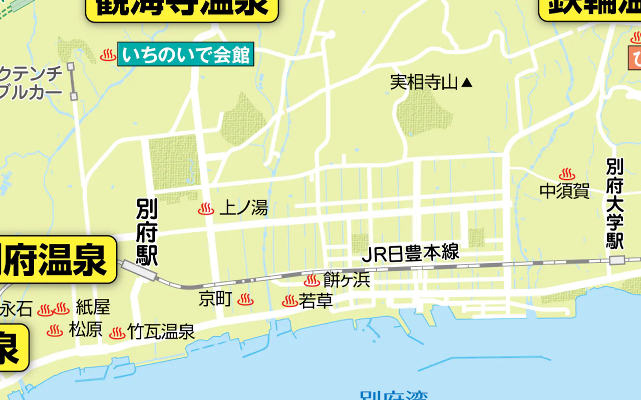 別府を代表する温泉地。宿や飲食店などが立てこむ繁華街ながら、狭い路地が縦横に走り、昔ながらの風情が残る。入浴料100~200円で楽しめる共同浴場の密集地帯でもある。