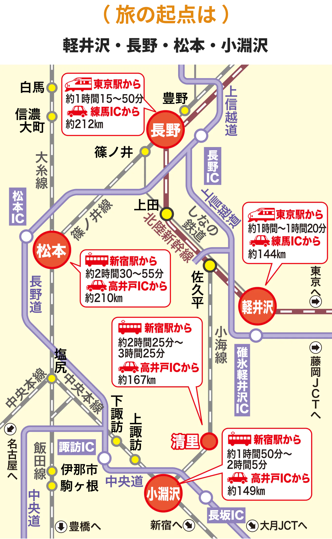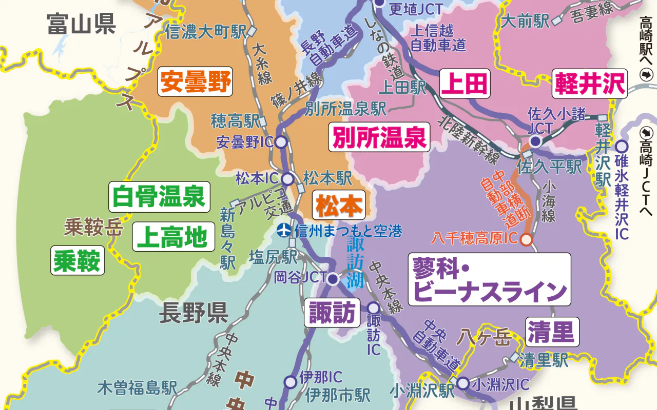 高原リゾートから長い歴史を誇る社寺、国宝の名城までみどころは盛りだくさん。各エリアの位置関係や特徴をチェックして、旅のプランをしっかり練ろう。