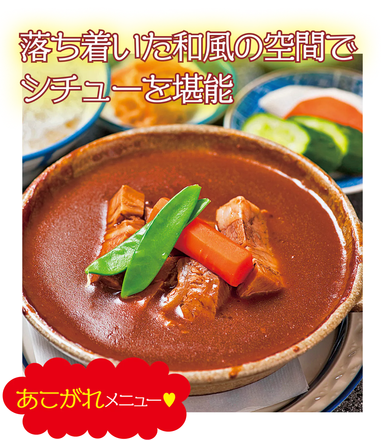昭和30年(1955)から守り続けられてきた味を提供するシチューとグラタンの専門店。18種類の秘伝の素材を手間ひまかけてじっくり煮込んだシチューはやみつきになること間違いなし。戦前の蔵を利用した、落ち着いた和風の空間で、レトロな金庫の鉄扉がそのまま残る。